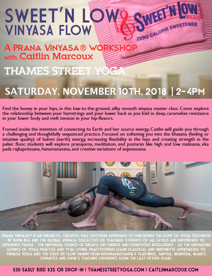 Find the honey in your hips, in this low-to-the-ground, silky smooth vinyasa master class. Come explore the relationship between your hamstrings and your lower back as you fold in deep, caramelize resistance in your lower body and melt tension in your hip-flexor tendons. Framed inside the intention of connecting to Earth and her source energy, Caitlin will guide you through a challenging and thoughtfully sequenced practice. Focused on softening you into the bhavana (feeling or intuitive quality) of buhmi (earth) energy, increasing flexibility in the hips and creating strength in the pelvic floor, students will explore pranayama, meditation, and postures like high and low malasana, eka pada rajkapotasana, hanumanasana, and creative variations of anjaneasana.